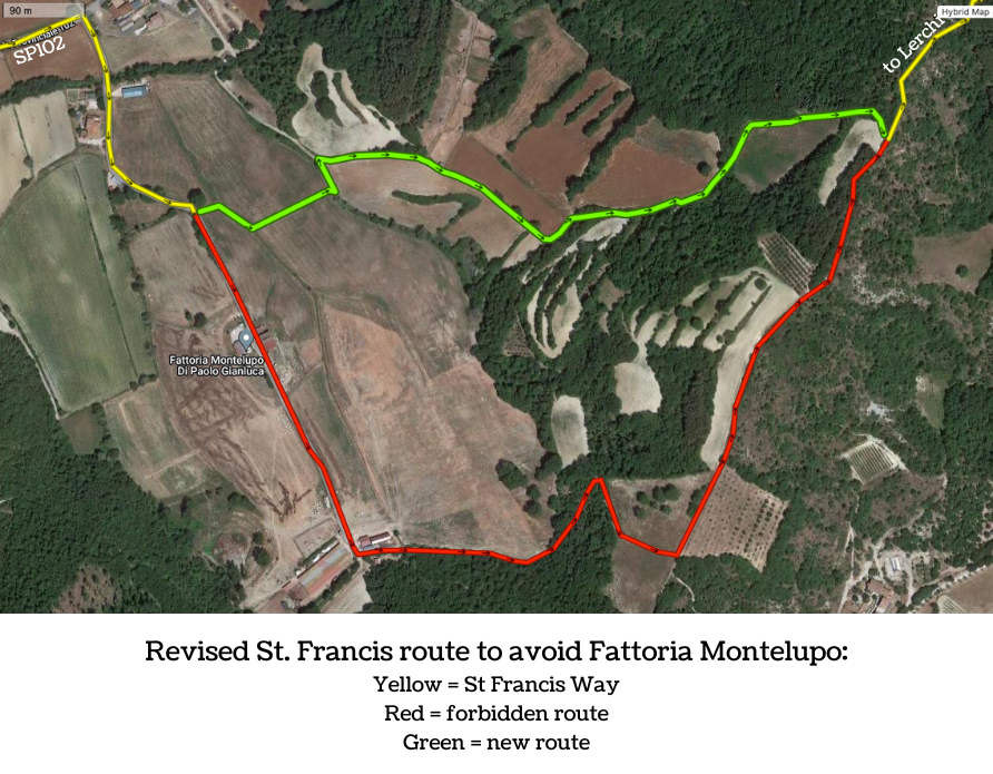 After crossing the SP102, follow the route as shown on this map. It is imperative not to enter the Montelupo farm.