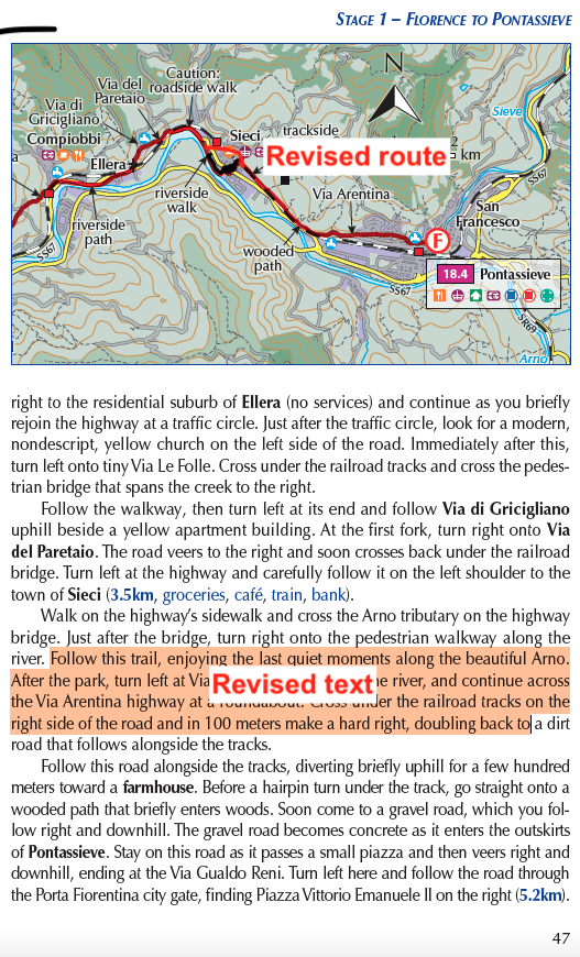 The exit from Sieci along the Arno has changed somewhat, providing a mildly gentler exit from town and an option to visit the Church of San Giovanni. The revised text reads:
