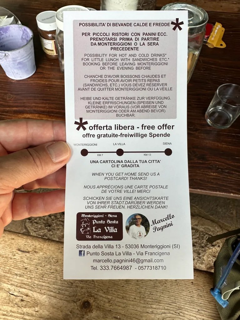 Somehow when I’ve arrived in the past at La Villa, about 6.5km after Monteriggioni on the way to Siena, the pilgrim rest area was unoccupied and bare, just a few tables and chairs. It’s now blossomed into a very helpful and abundant resource, an enterprise of its owner, Marcello Pagnini. He has snacks and drinks by donation and also has “affittacamere” (overnight room rentals), complete with the option of half-board. It’s a nice pitstop on the otherwise unserviced route to Siena and is covered in the 2024 printing of my Via Francigena Part 3 guidebook. Here are some pics of the rest area and Marcello and me.